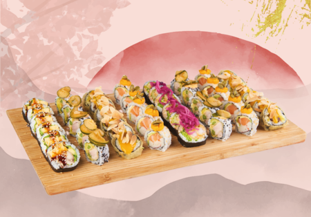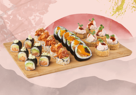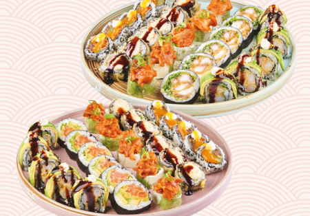 Hosomaki z łososiem, awokado i sałatką z pora (6 szt.) • volcano roll z sałatką surimi, sosem kimchi i kiełkami (6 szt.) • uramaki z krewetką w tempurze, awokado i kiszoną kapustą kimchi (5 szt.) • futomaki z łososiem, tamago, marynowaną tykwą i sosem mango-chili (6 szt.).