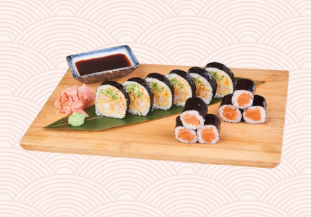 Futomaki z krewetką w tempurze, ogórkiem i szczypiorem (6 szt.) • hosomaki z łososiem (6 szt.).
