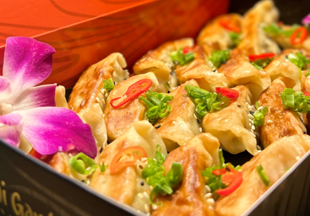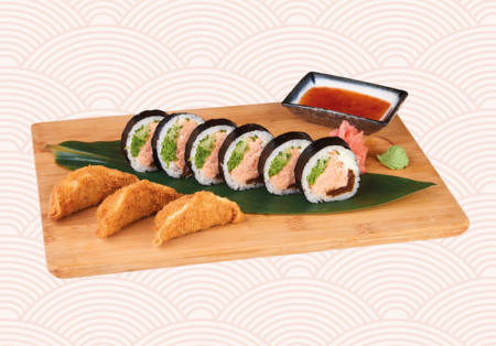 Futomaki z grillowanym łososiem, ogórkiem i marynowaną tykwą (6 szt.) • pierogi gyoza w panko, z kurczakiem i warzywami (3 szt.).