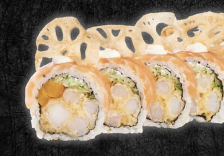 Potwornie wielkie uramaki z 5 olbrzymimi krewetkami w tempurze, pieczoną dynią, chipsem z lotosu i sosem kabayaki, zaklęte w łososiu.