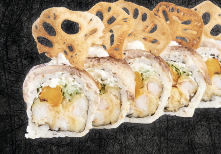 Potwornie wielkie uramaki z 5 olbrzymimi krewetkami w tempurze, pieczoną dynią, chipsem z lotosu i sosem kabayaki, zaklęte w węgorzu kabayaki.