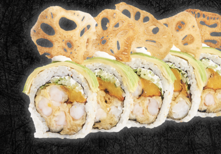 Potwornie wielkie uramaki z 5 olbrzymimi krewetkami w tempurze, pieczoną dynią, chipsem z lotosu i sosem kabayaki, zaklęte w awokado.