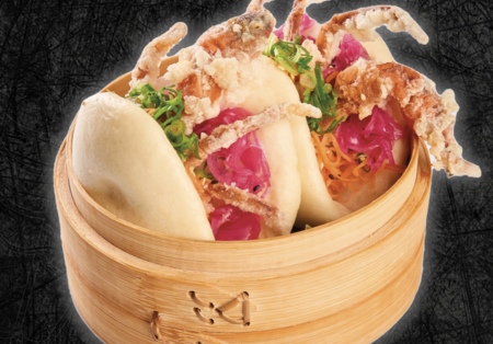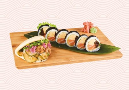Bao z szarpaną wieprzowiną, piklami z ogórka i sosem korean mayo (1 szt.) • futomaki z łososiem, tamago i marynowaną tykwą (6 szt.).