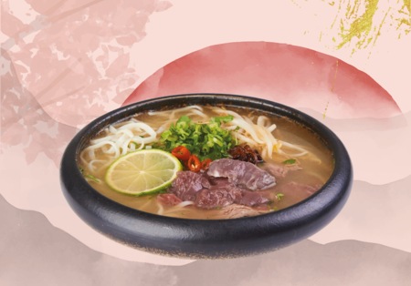 Z polędwicą wołową, makaronem ryżowym, kiełkami fasoli mung, grzybami mun, kolendrą.