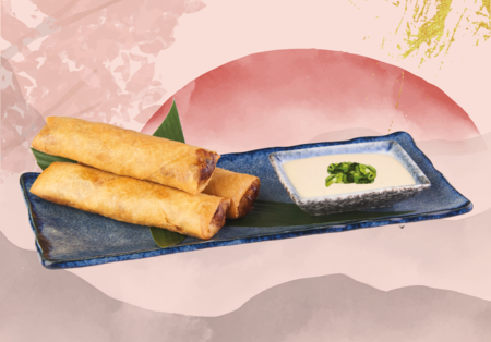 Lekka rolka w płatku sojowym, z marynowaną tykwą w tempurze, warzywami w tempurze i sosem kabayaki.