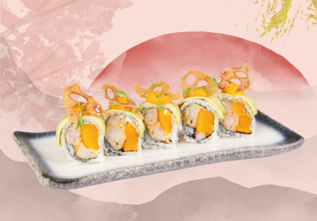 Słodka, chrupiąca rolka w panko, z tamago, marynowaną tykwą, mango i liofilizowanym owocem.