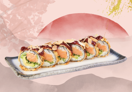 Rolka w migdałach i tempurze, z łososiem, awokado, mango i sosem sweet mango-chili.