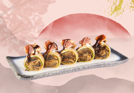Rolka z bakłażanem w panko, sałatą, figą, orzechami włoskimi i sosem kabayaki.