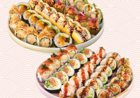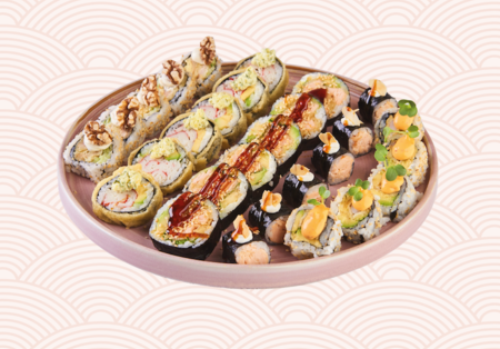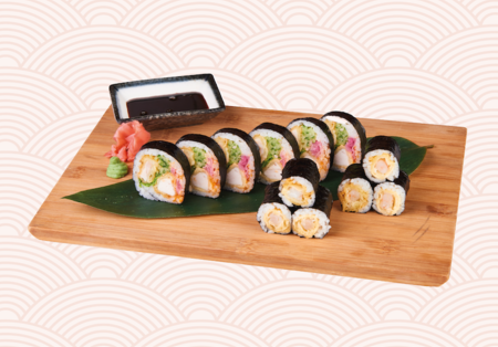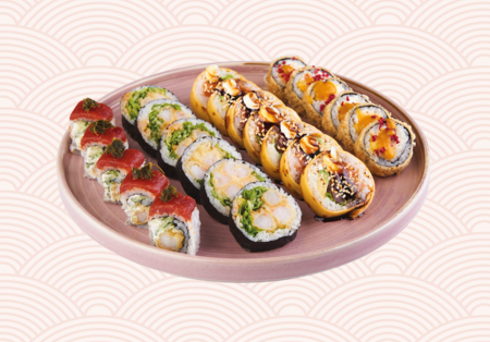 Futomaki z sumem kabayaki, awokado, tamago i sosem kabayaki (6 szt.) • uramaki z tuńczykiem w tempurze, szparagiem w tempurze i piklami (12 szt.) • tempura roll z marynowaną rzodkwią, tykwą, pulpą mango i migdałami (10 szt.) • uramaki z łososiem, surimi, awokado, musem z dyni i pestkami z dyni (10 szt.) • futomaki z krewetką w tempurze, ogórkiem, sosem spicy mayo i szczypiorem (6 szt.).
