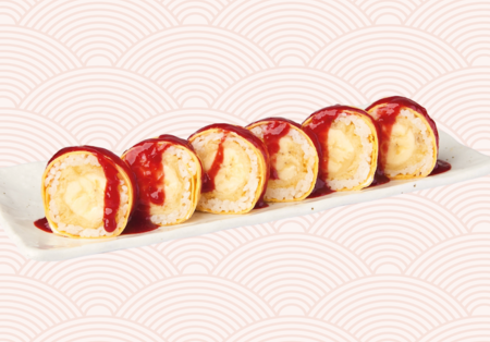 Rolka w słodkim naleśniku z bananem w tempurze i purée z owoców.