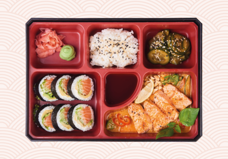 futomaki z łososiem (6 szt.) • curry panang z łososiem • pikle z ogórka • ryż • imbir • wasabi • sos sojowy.
