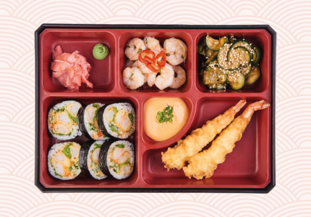 Futomaki z kurczakiem w tempurze, marynowaną cebulką i sosem spicy mayo (6 szt.) • hosomaki z krewetką w tempurze (6 szt.).