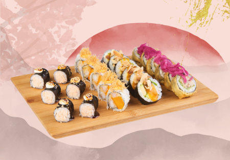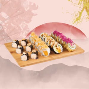 Futomaki z krewetką w tempurze, ogórkiem i marynowaną cebulką (6 szt.) • uramaki z krewetką w tempurze, awokado i owocem (10 szt.) • tempura roll z surimi, awokado, yuzu mayo i pulpą mango (12 szt.) • uramaki z węgorzem w tempurze, tamago i migdałami (10 szt.) • futomaki z łososiem, warzywami i kiełkami rzodkwi (6 szt.).