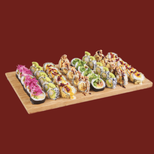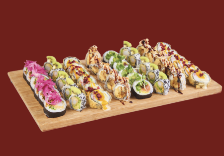 Hosomaki z grillowanym łososiem i sosem kabayaki (6 szt.) • uramaki z krewetką w tempurze, dynią i kataifi (5 szt.) • futomaki z surimi, awokado, sosem mango-chili i migdałami (6 szt.) • tempura roll z gotowanym sumem, sosem tonkatsu i marynowaną cebulką (6 szt.).