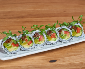 Rolka z marynowaną tykwą, awokado, marynowaną rzodkwią, mango i sezonowym owocem.