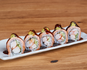 Rolka z gotowaną krewetką, awokado, łososiem, sałatką fire i sosem kabayaki.