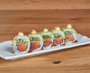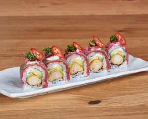Rolka z krewetką w panko i awokado, otulona opalanym łososiem, zwieńczona chili i marynowaną czerwoną cebulą.