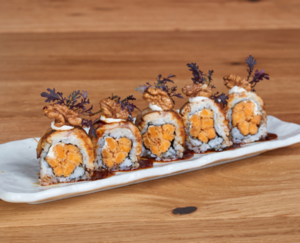 Chrupiąca rolka w posypce panko, z krewetką w panko, awokado, smażoną krewetką, sosem spicy mayo, sosem kabayaki i kiełkami.