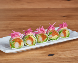 Lekka rolka bez ryżu, z krewetką w tempurze, tatarem z łososia, awokado i marynowaną cebulką, w płatku ryżowym.