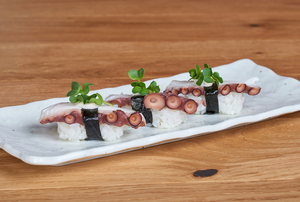 Nigiri z ośmiornicą, majonezem truflowym i kiełkami.