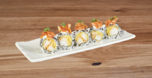 Rolka z krewetką w tempurze, awokado, łososiem, sosem spicy mayo i szczypiorem.