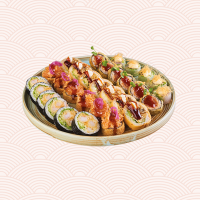 futomaki z krewetką w tempurze (6 szt.) • volcano roll z łososiem tataki i cebulką (6 szt.) • datemaki z węgorzem w tempurze (7 szt.) • tempura roll z tatarem z tuńczyka (6 szt.) • summer roll z białą rybą i kataifi (5 szt.). Porcja dla 2-3 osób.