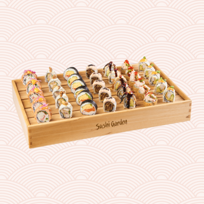 uramaki z łososiem i surimi (5 szt.) • uramaki z sumem w tempurze i orzechami (5 szt.) • futomaki z łososiem, tamago i surimi (6 szt.) • uramaki z marynowaną tykwą i pastą z krewetki (5 szt.) • dragon roll z węgorzem (5 szt.) • volcano roll z sałatką surimi i tobiko (6 szt.) • uramaki z krewetką w tempurze i kiełkami (5 szt.). Porcja dla 3-4 osób.