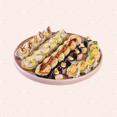 uramaki z sumem w tempurze i orzechami (5 szt.) • tempura roll z surimi i sałatką z pora (6 szt.) • futomaki z łososiem w tempurze (6 szt.) • hosomaki z grillowanym łososiem i migdałami (6 szt.) • uramaki z krewetką w temapurze i kiełkami (5 szt.). Porcja dla 2-3 osób.